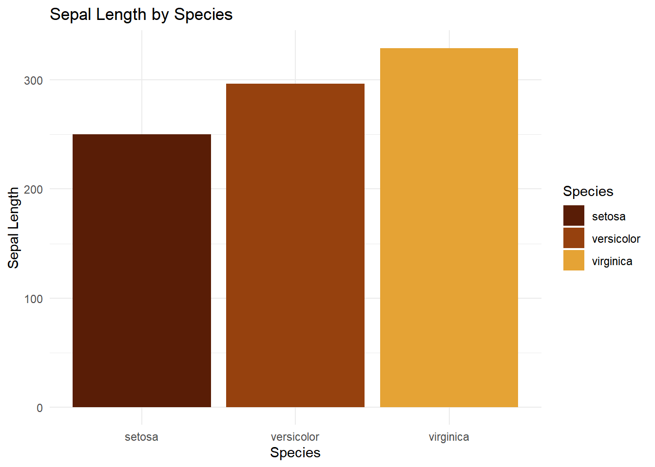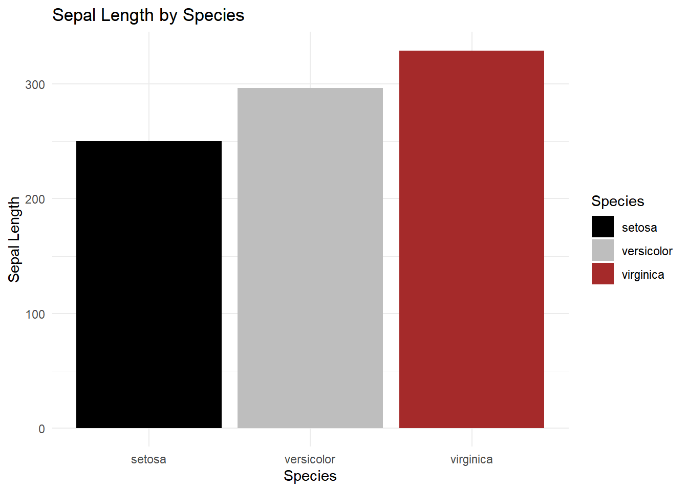 ggplot(iris, aes(x = Species, y = Sepal.Length, fill = Species)) +geom_bar(stat ="identity") +labs(title ="Sepal Length by Species", x ="Species", y ="Sepal Length") +theme_minimal()+scale_fill_manual(values =c("black", "grey", "brown"))