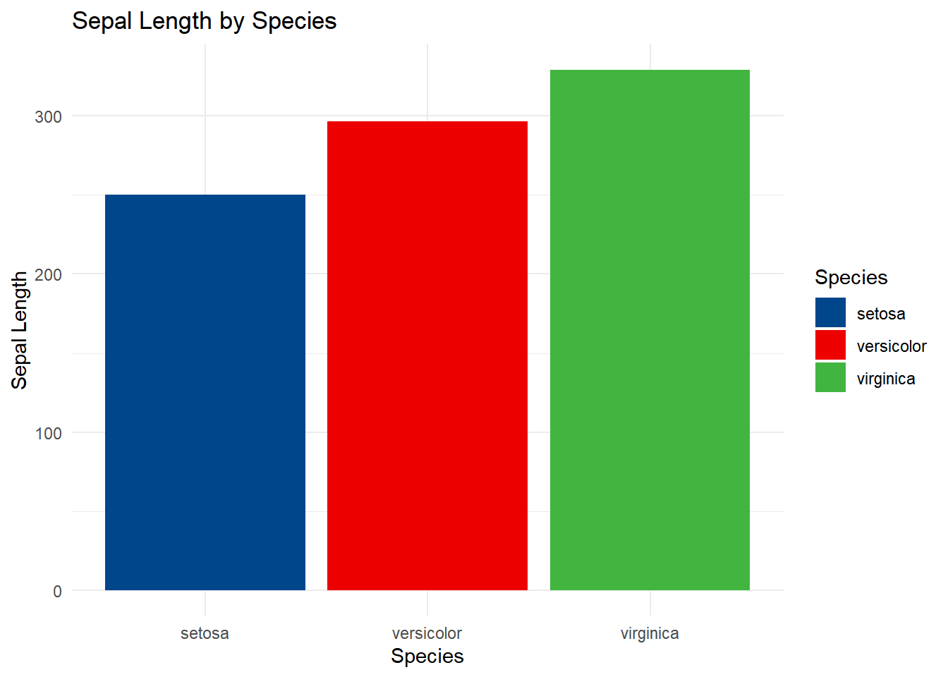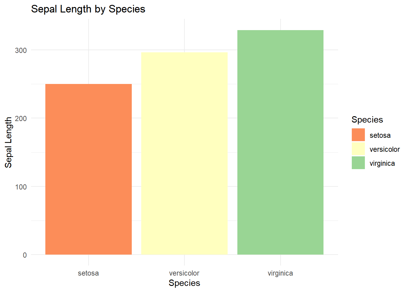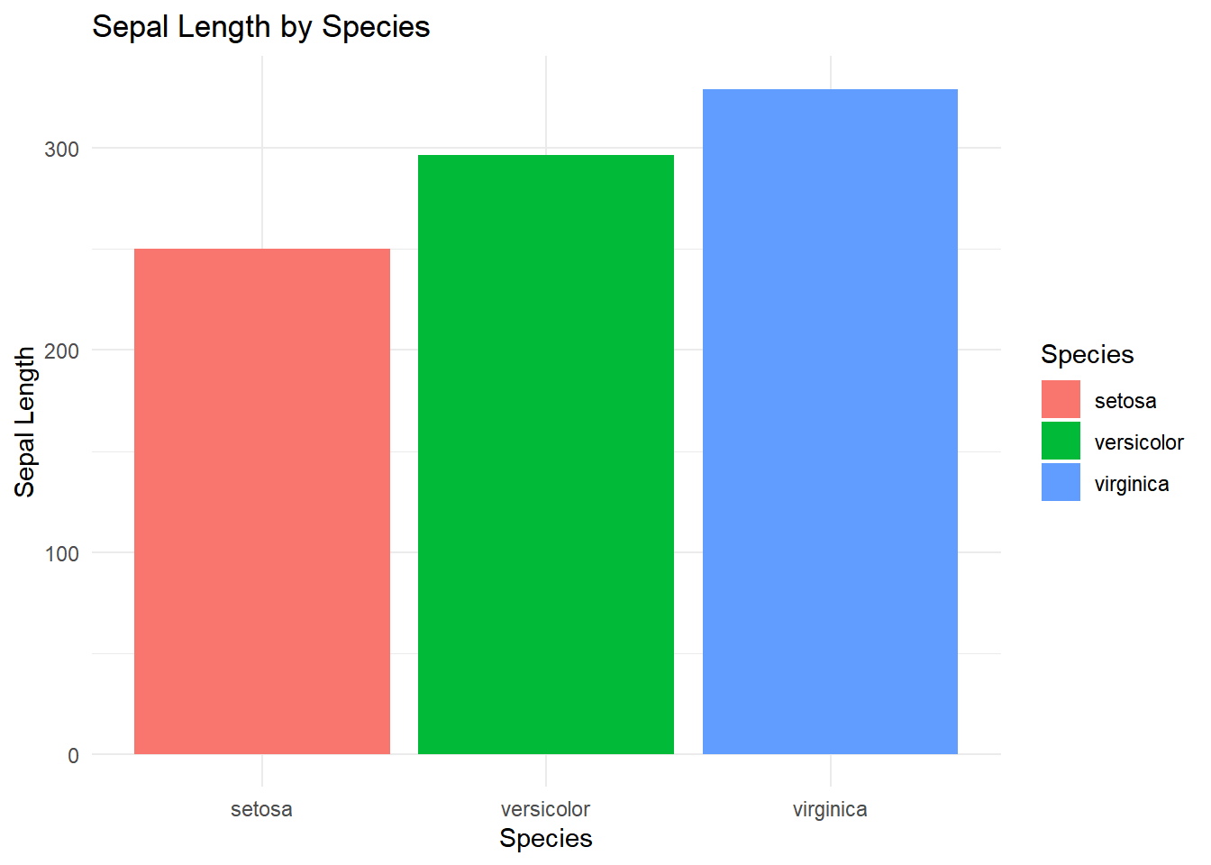 ggplot(iris, aes(x = Species, y = Sepal.Length, fill = Species)) +geom_bar(stat ="identity") +labs(title ="Sepal Length by Species", x ="Species", y ="Sepal Length") +theme_minimal()