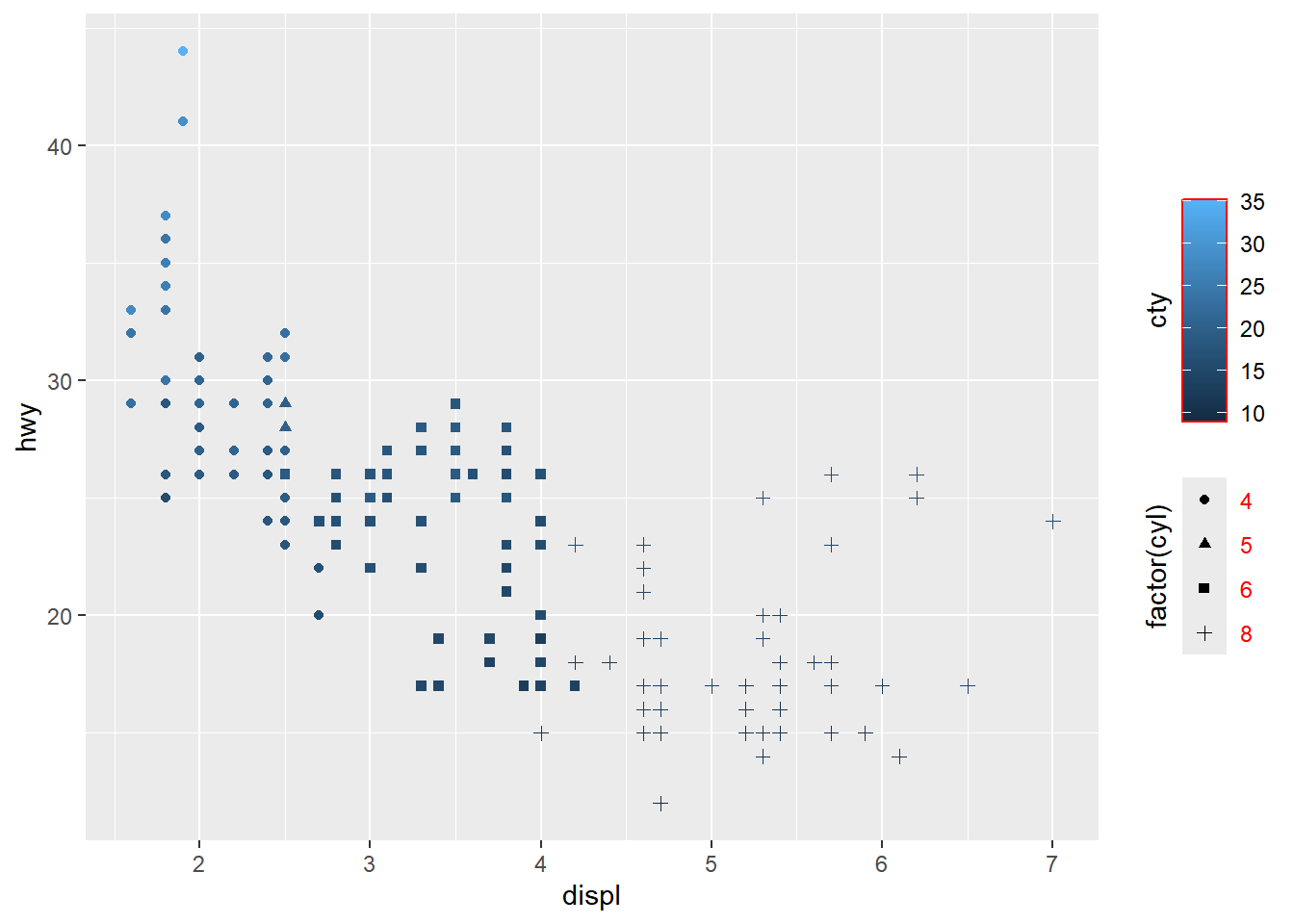 ggplot(mpg, aes(displ, hwy, shape = factor(cyl), colour = cty)) +