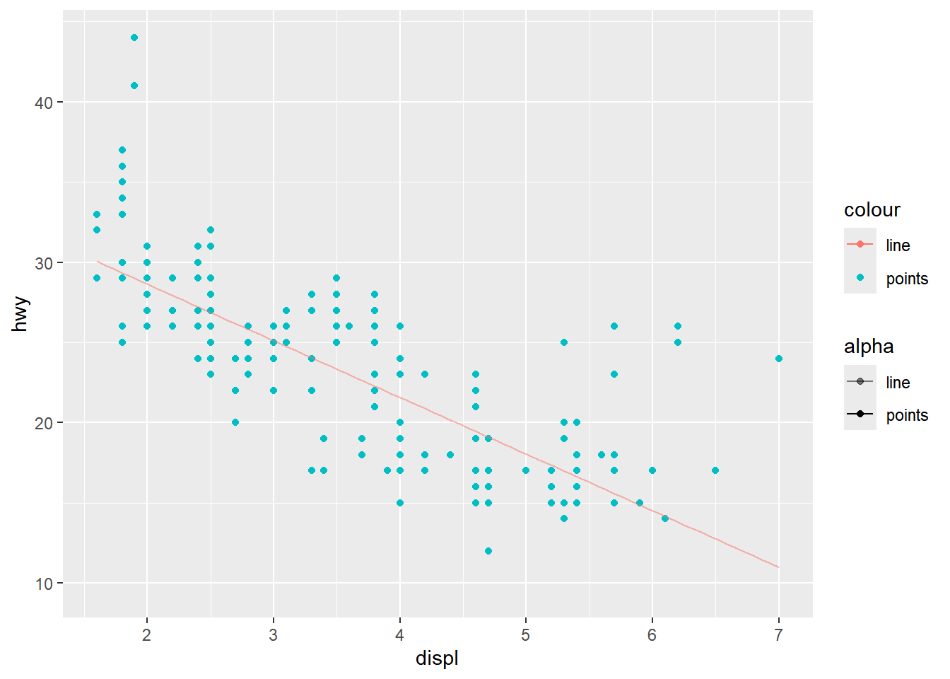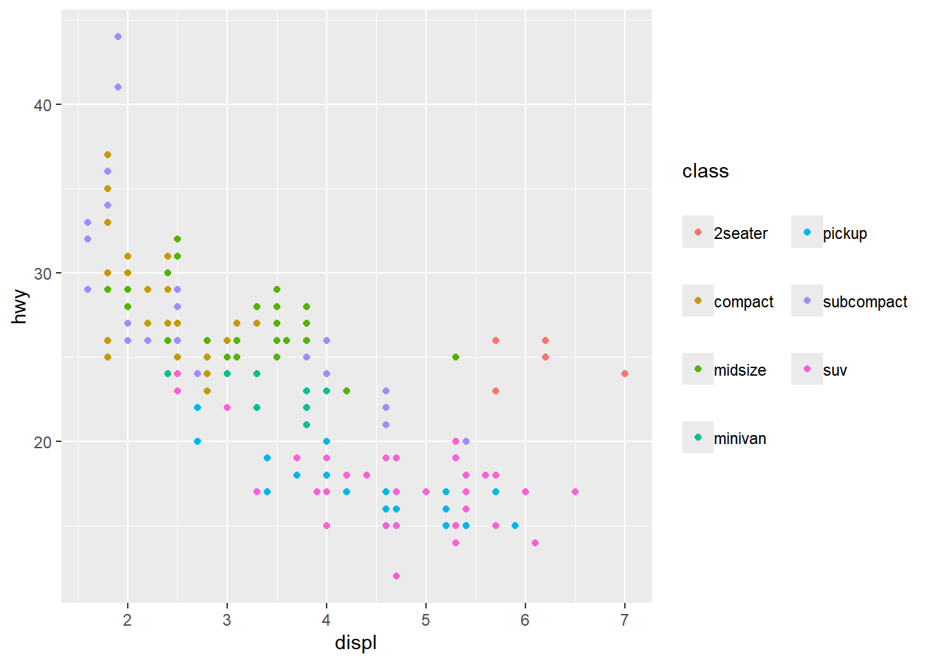 ggplot(mpg, aes(displ, hwy, colour = class)) +