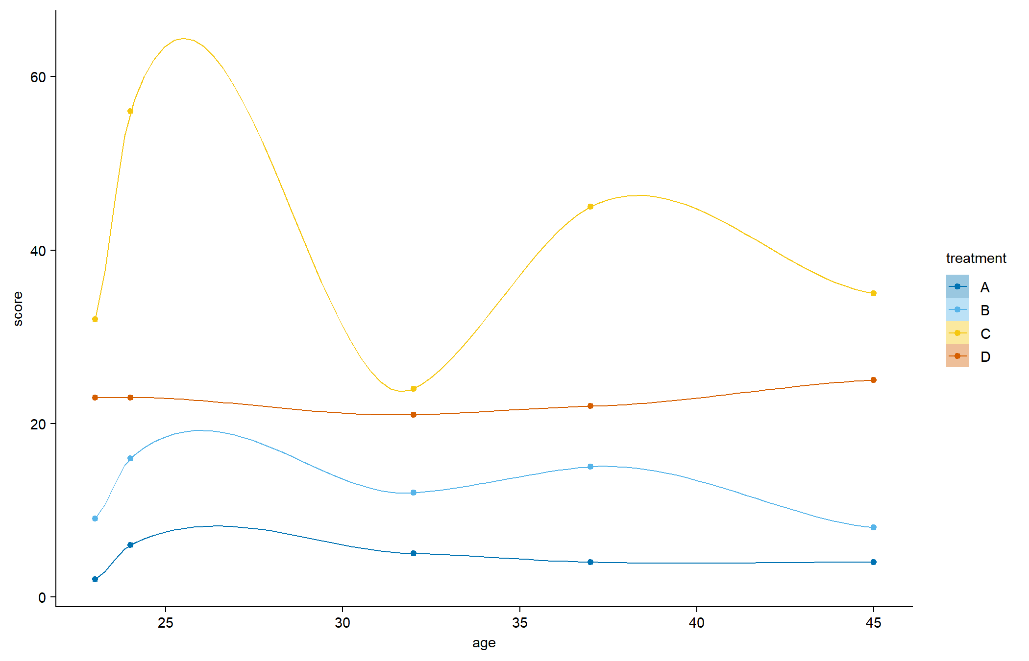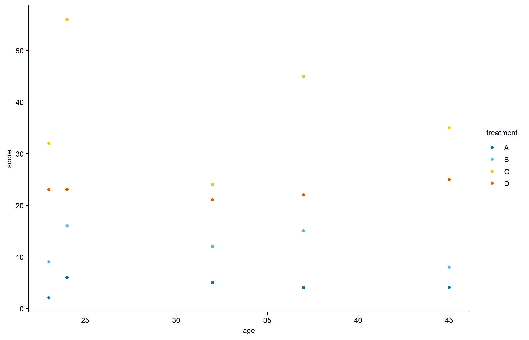 tidyplot(x = age, y = score, color = treatment) |>