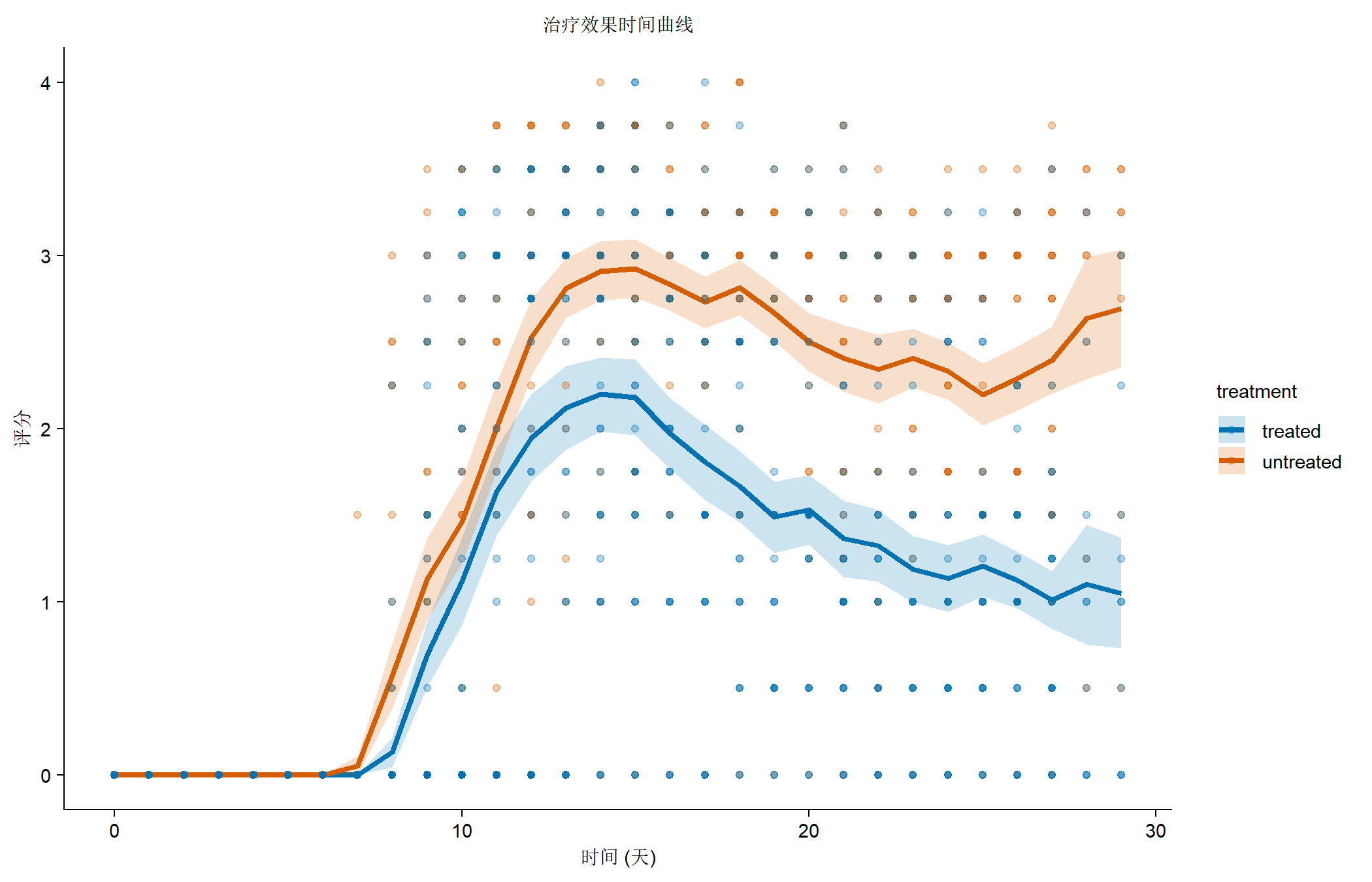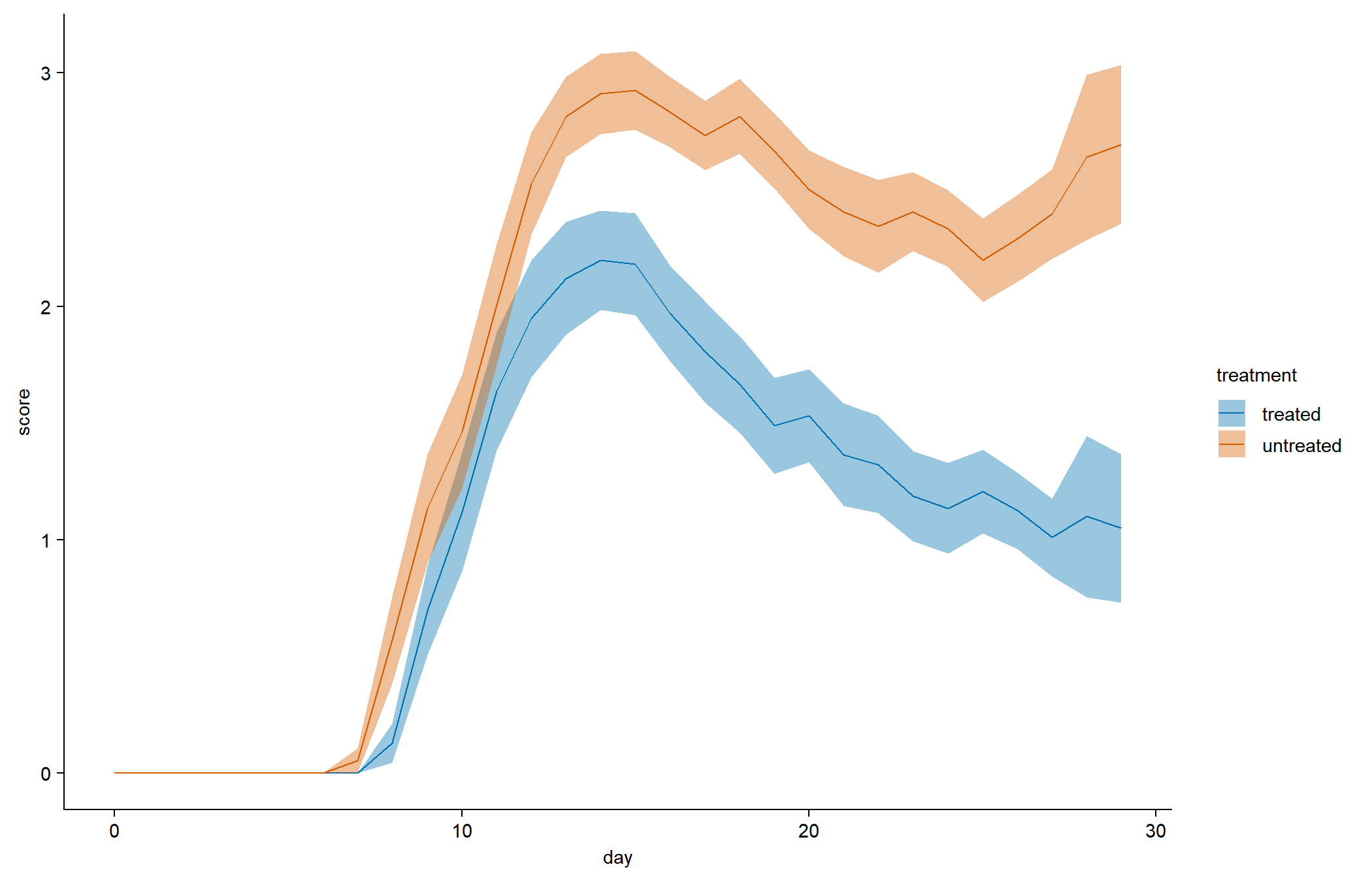 tidyplot(x = day, y = score, color = treatment) |>