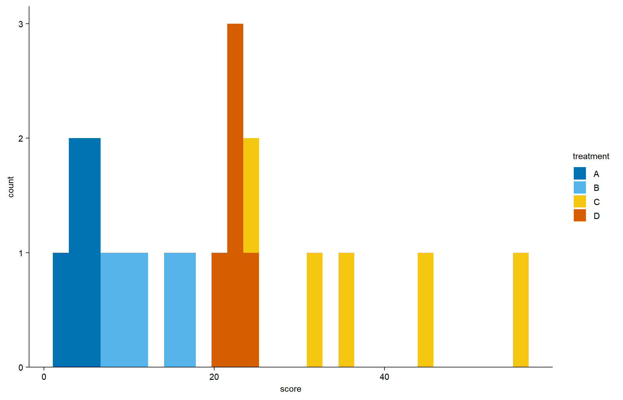 tidyplot(x = score, color = treatment) |>