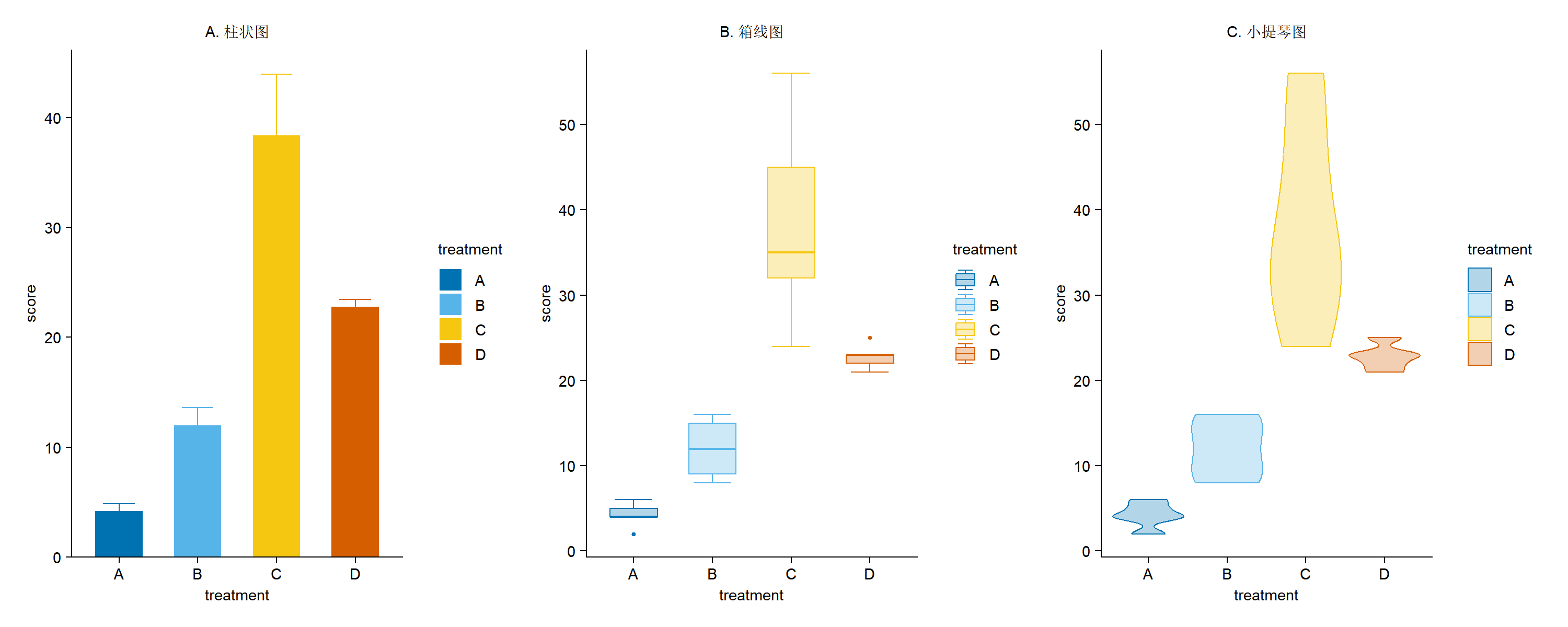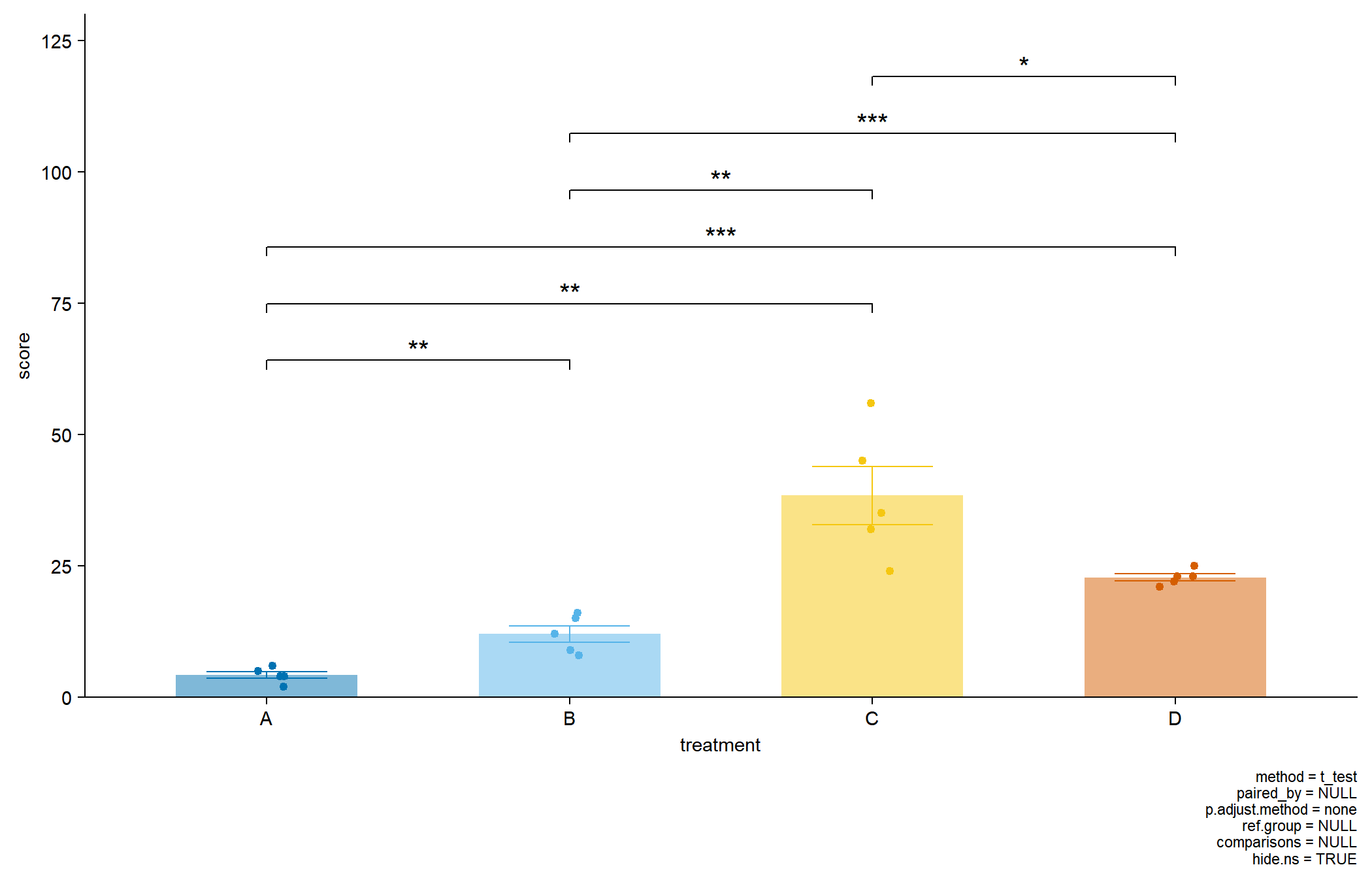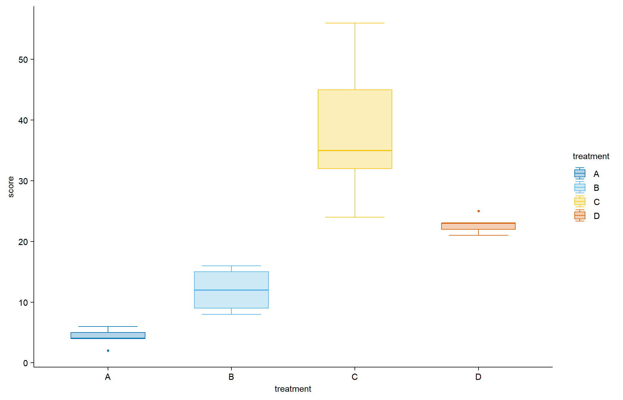 tidyplot(x = treatment, y = score, color = treatment) |>