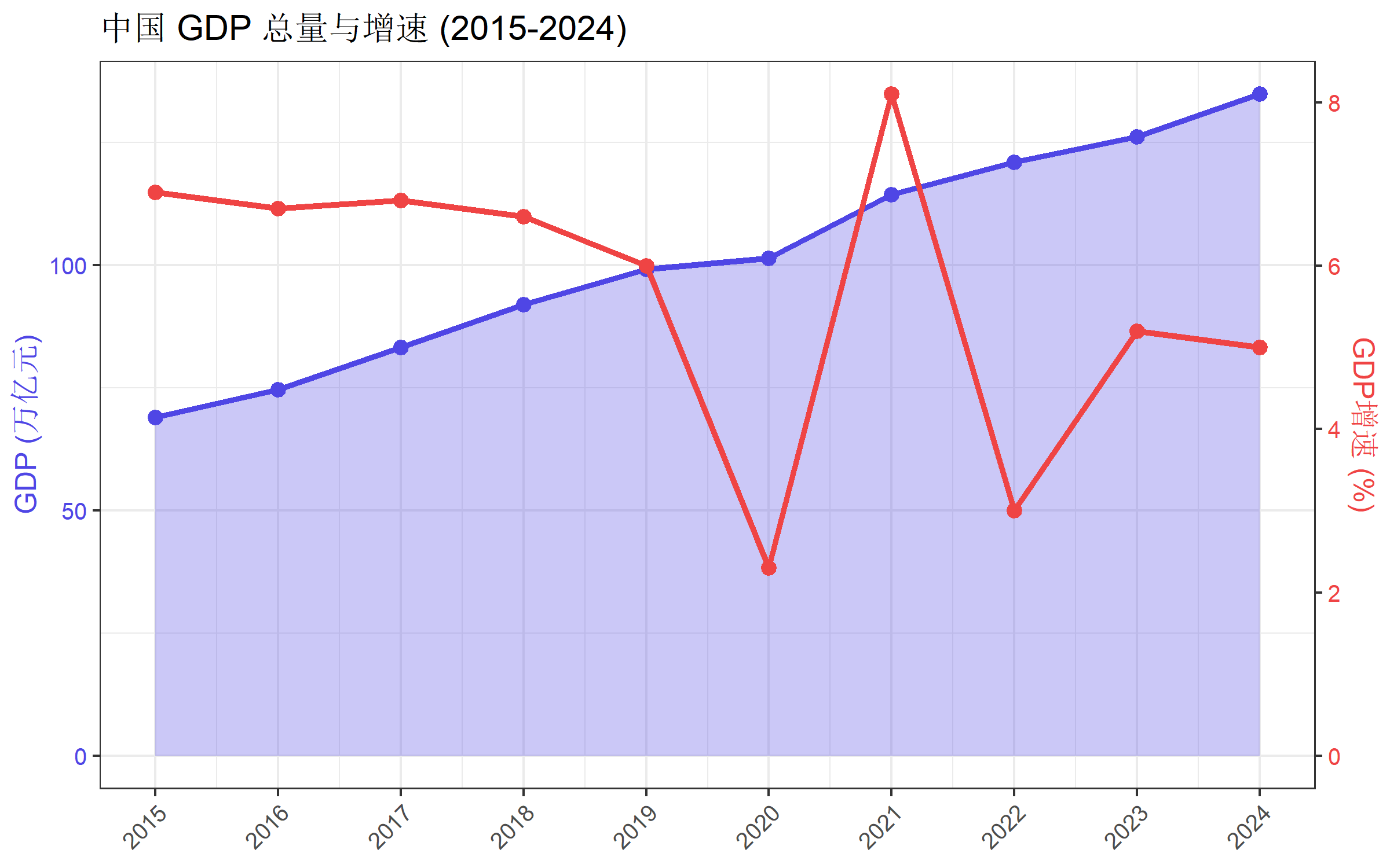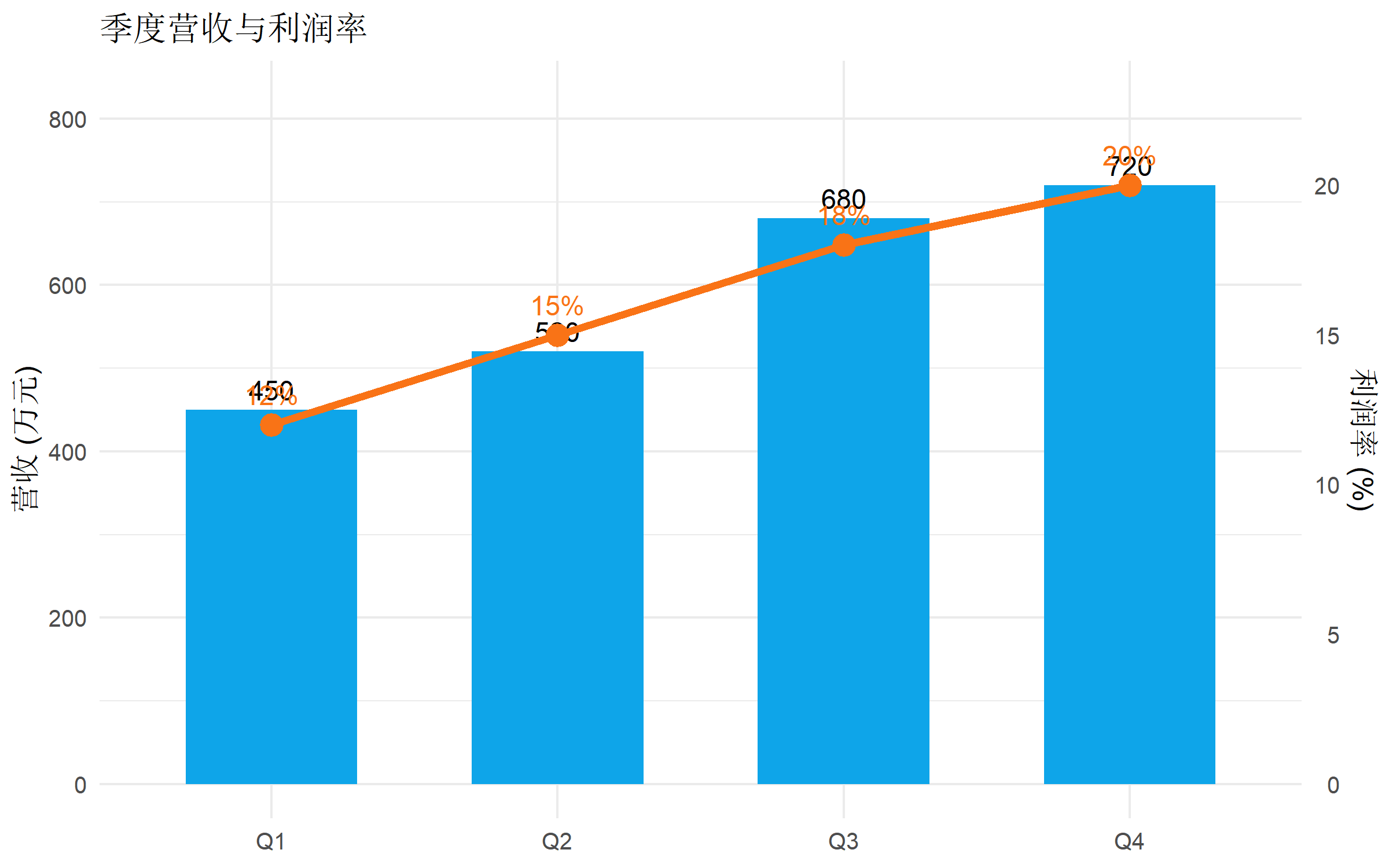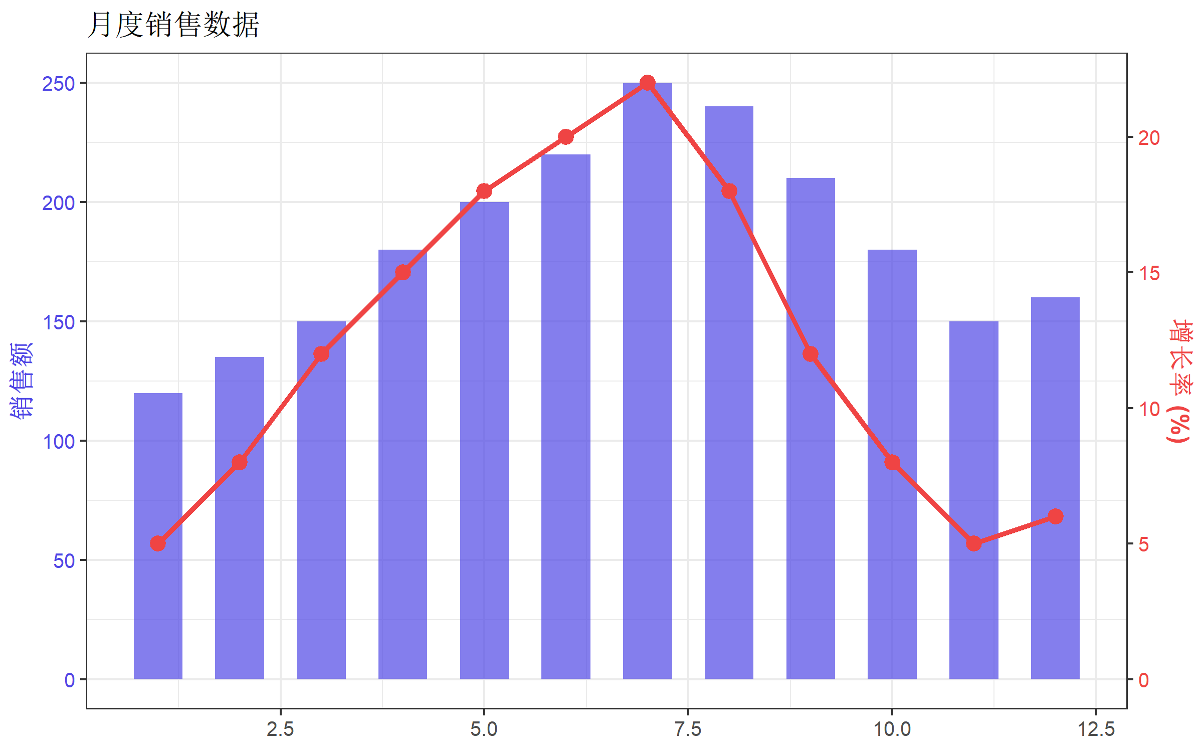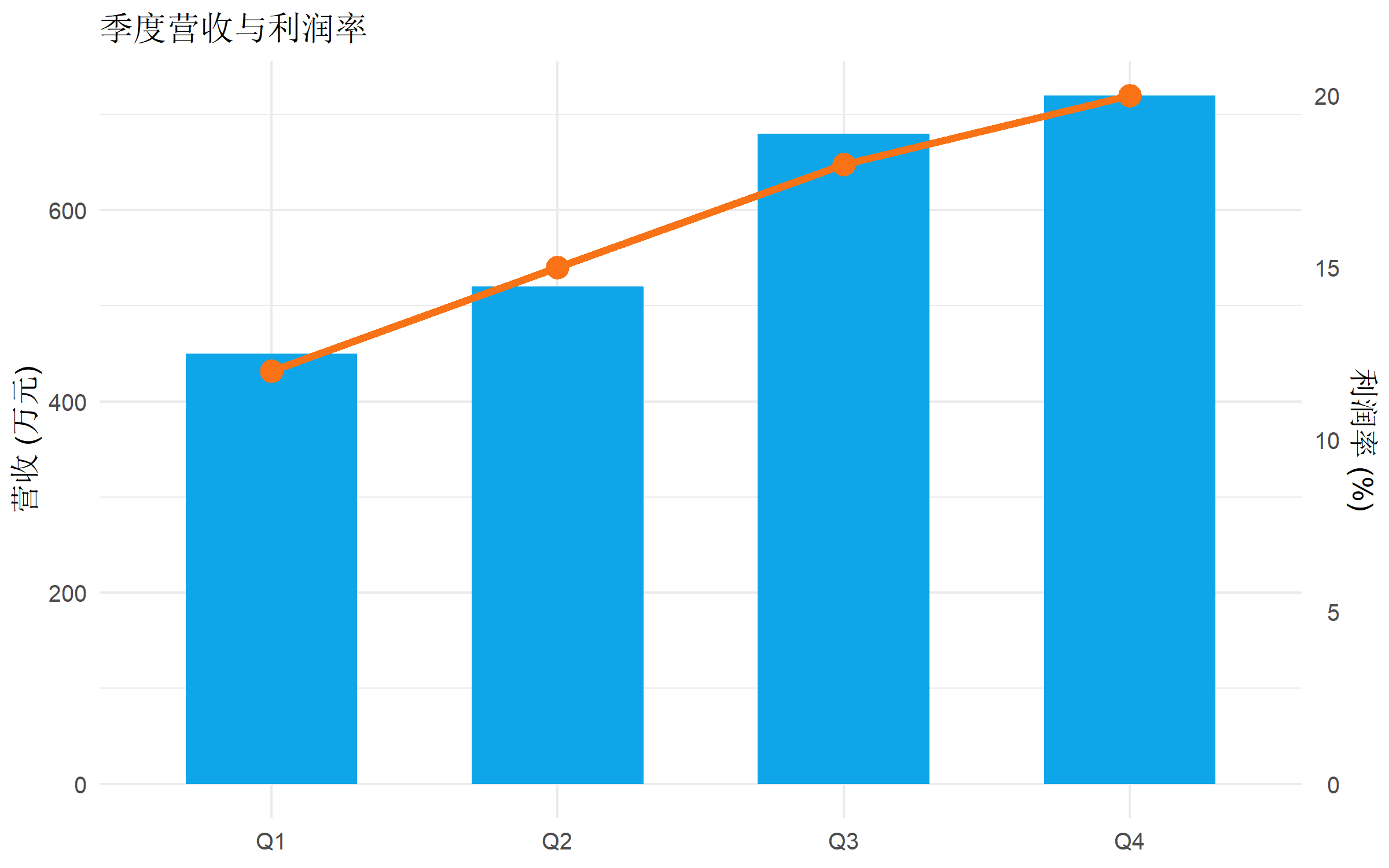 双坐标轴(Dual Y-Axis)图表可以在同一张图中展示两个量纲不同的变量,常用于展示趋势对比、柱线混合图等场景。本教程介绍如何在 ggplot2 中实现双坐标轴绑图。