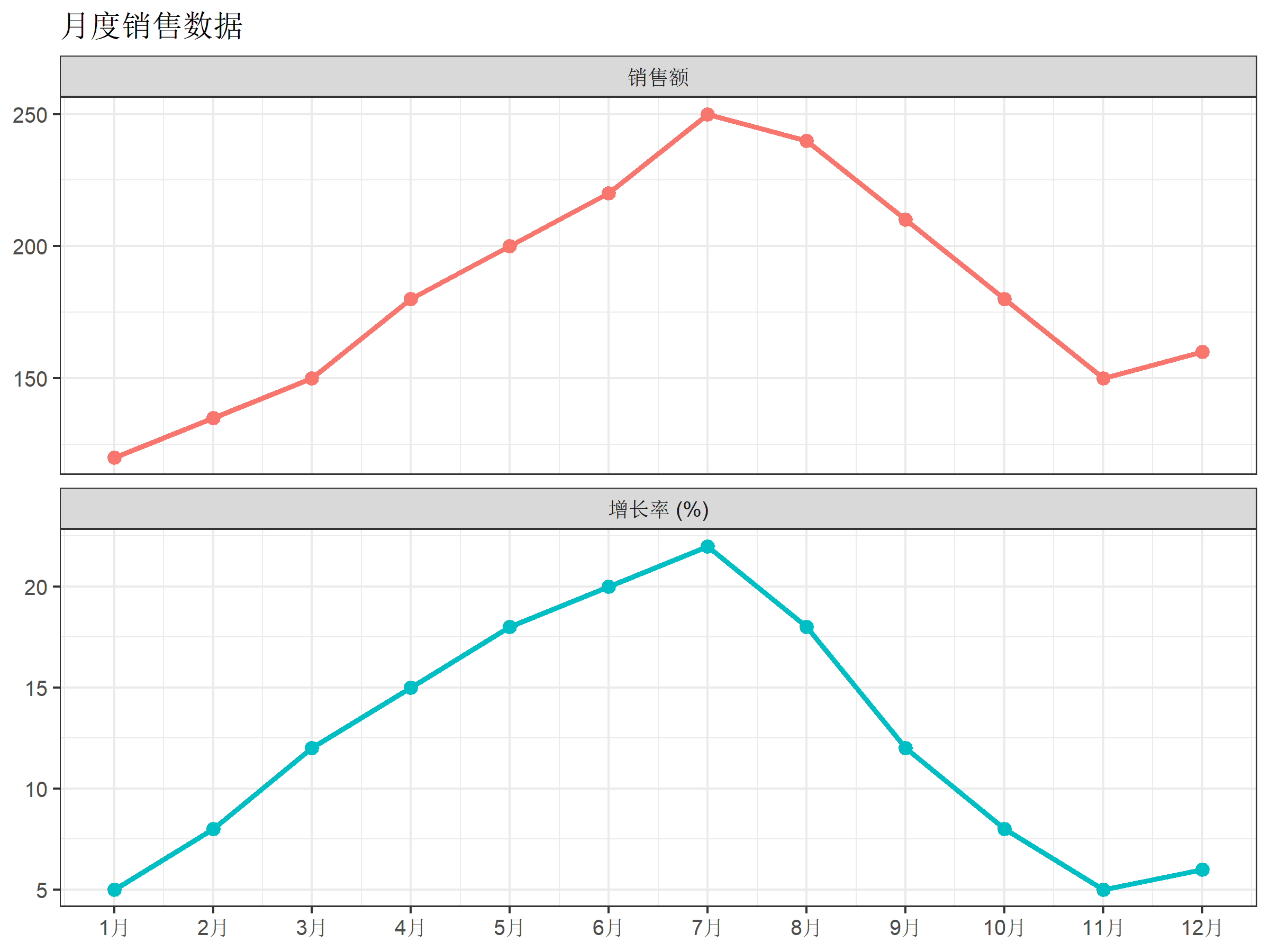 labs(title = "月度销售数据", x = NULL, y = NULL, color = NULL) +