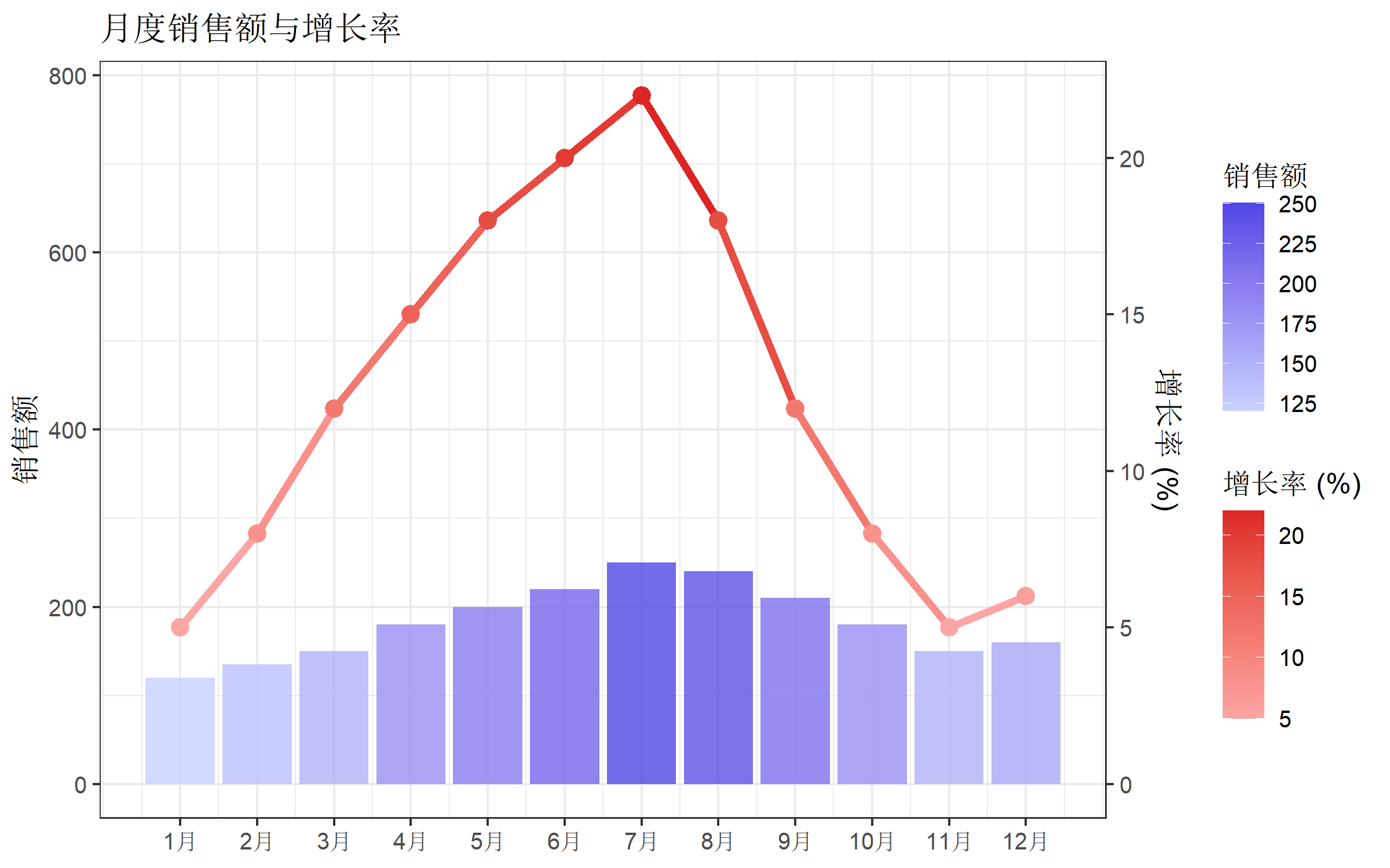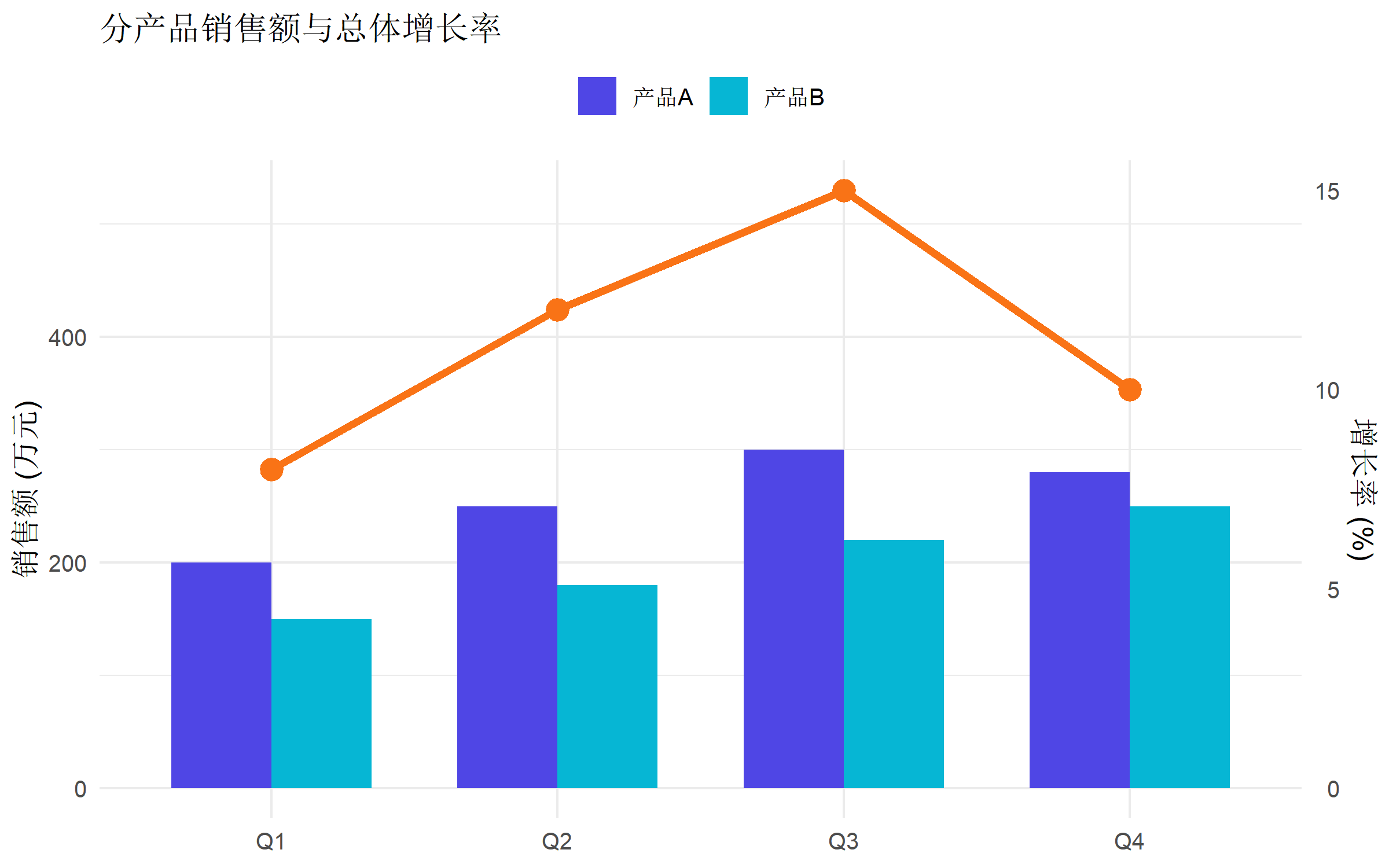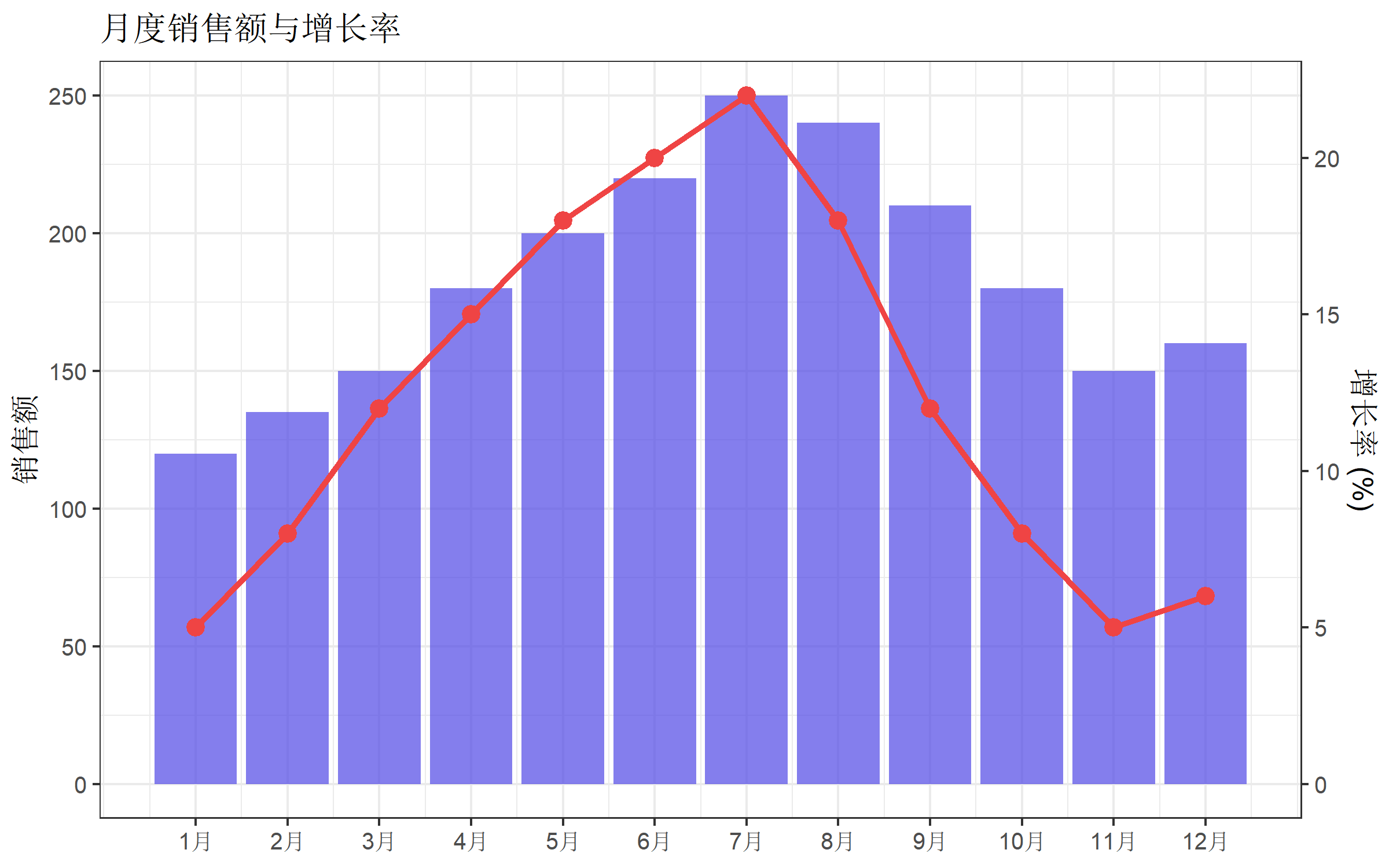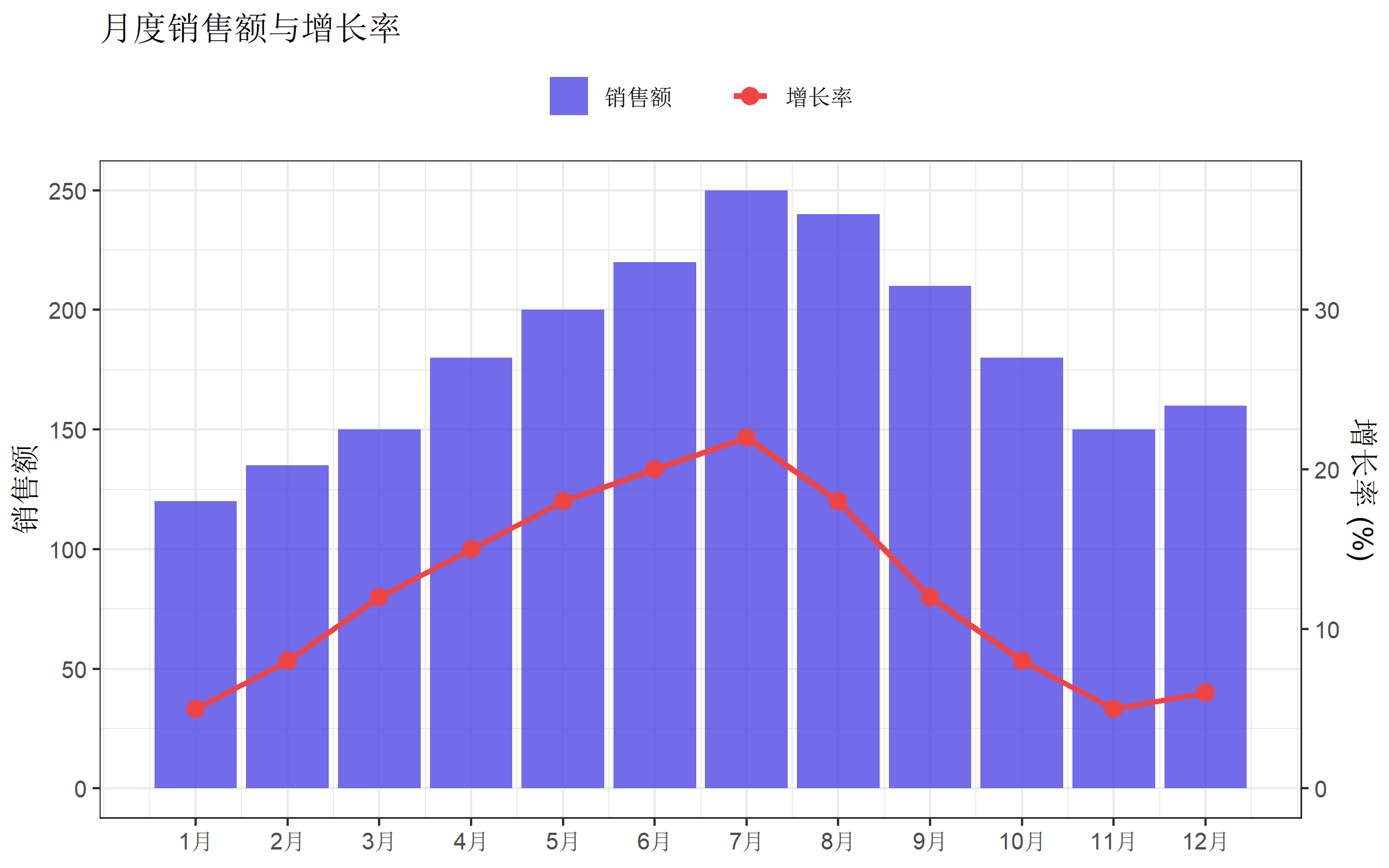 | 柱线混合图 | 柱状图显示销量,折线图显示增长率 |