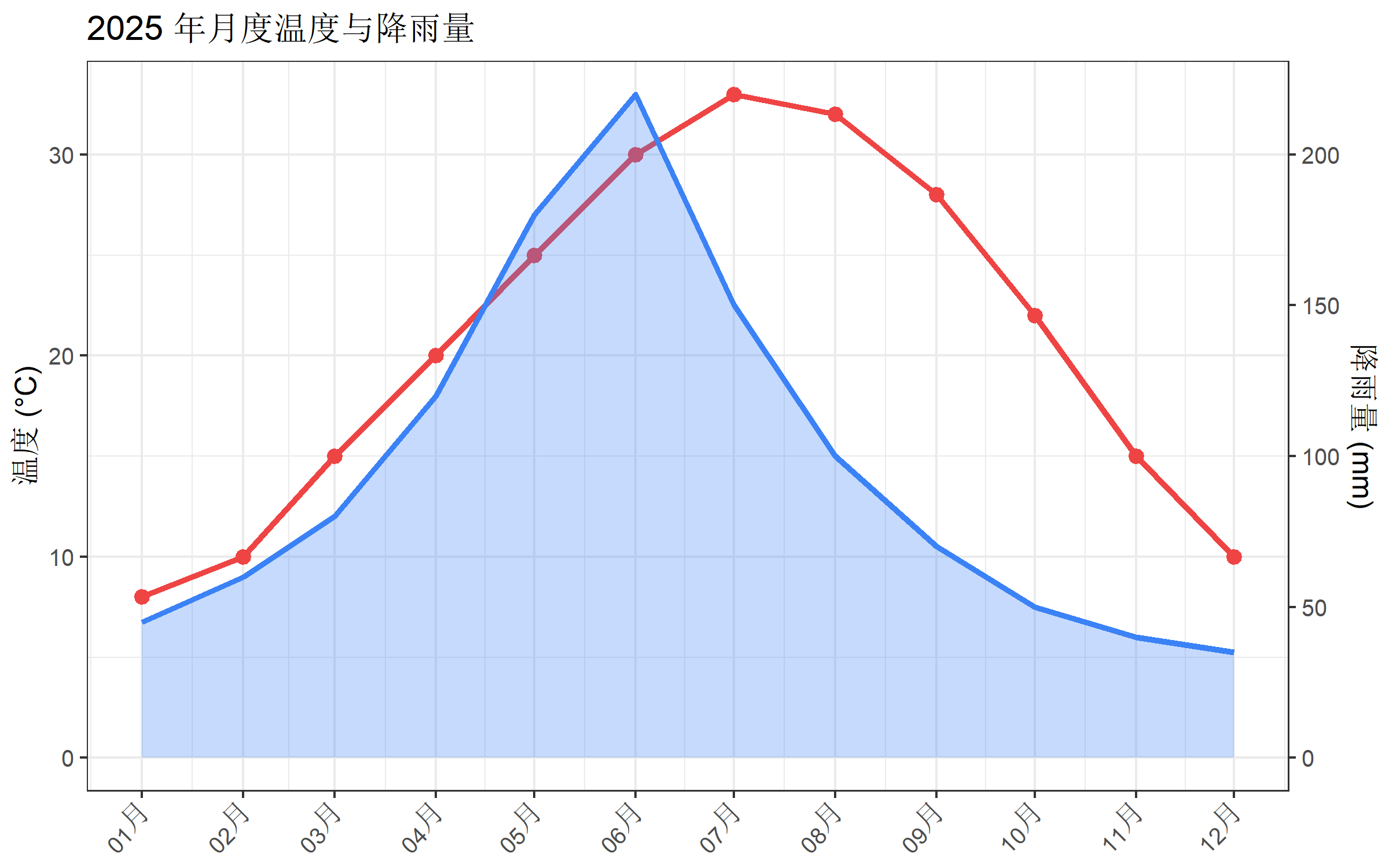 labs(title = "2025 年月度温度与降雨量", x = NULL) +